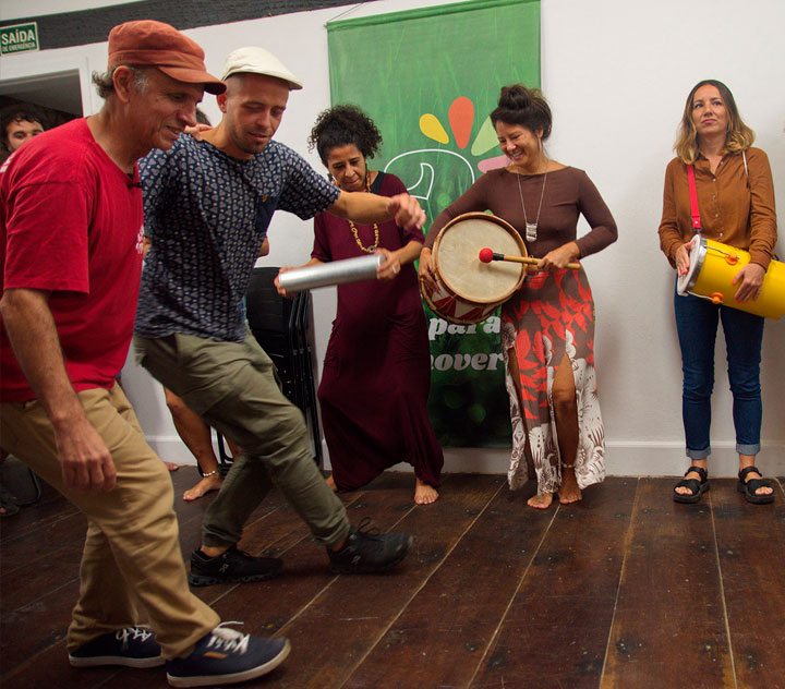 A educação para estar viva é preciso ter ludicidade e alegria, sendo assim fizemos uma troca de experiências sobre nossas memórias das brincadeiras de infância em nossos territórios de raiz. E a partir de jogos corporais, que trouxeram o canto, a dança, a música e o ritmo, foram se revelando tradições locais paratienses e a reflexão de como essas pedagogias brincantes podem potencializar os diversos aprendizados. Dialogamos sobre a potência dos ciclos festivos das tradições brasileiras e de Paraty e como conhecer o nosso próprio território pode germinar nas crianças e jovens a autoestima e o prazer com o conhecimento. O papel do educador é ser multiplicador e neste sentido esses dois encontros, que tiveram a participação de cerca de 60 profissionais, fez crescer em cada um a semente do prazer de ensinar e aprender. A primeira oficina aconteceu na Escola Municipal Parque da Mangueira, em março de 2024, com educadores de toda a escola e a segunda oficina foi realizada no Sesc Santa Rita, em julho de 2024, com educadores (as) de diversas escolas municipais de Paraty.